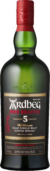 Ardbeg Beastie 5 YO er den seneste udgivelse i Ardbeg Distillerys permanente sortiment. Et monster af en whisky og et ægte Islay ikon. Wee Beastie er fem år gammel, men en livlig ung skabning med en formidabel smag.Ardbeg Distillerys whisky skabere satte sig for at fremstille den mest rå og røgede Ardbeg nogensinde. Resultatet er Wee Beastie, og denne smukke, røgfyldte dram, der prikker på tungen, er den yngste Ardbeg, destilleriet nogensinde har lavet. Den er modnet fem år på ex-bourbon og Oloroso sherry fade.I næsen blandes intense aromaer af knust, sort peber med saftig fyrretræsharpiks og en skarp røg. Pludselig eksploderer smagen med chokolade, kreosot og tjære. Eftersmagen er lang og salt og dækker munden.Denne whisky er intens og er ikke er tæmmet af alder. Kan nydes rent eller som den lækre hovedingrediens i en stærkt røgfyldt cocktail.