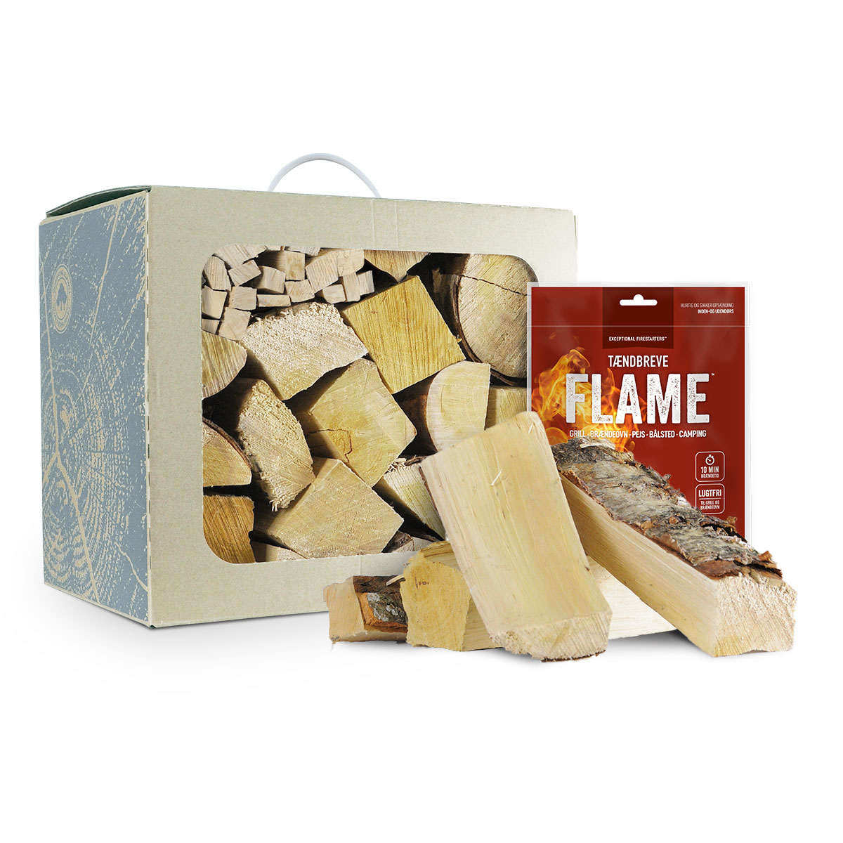 Brændeboks med birk, optændingspinde og optændingsbreve (25 stk)