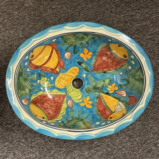 BIG håndvask til nedfældning i bordpladen. Fiskemotiv i Keramiske mexicansk håndvask. Størrelse 56 x 44 cm. Den store størrelse.