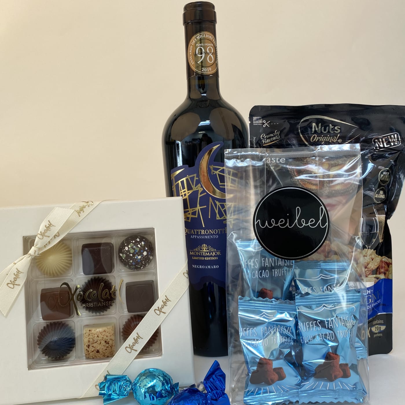 GaveKassen indeholder en flaske rødvin, der er saftig og fyldt med frugtrig smag. Vinen falder i god jord hos mange og er derfor ofte brugt til fester, da de fleste finder vinene efter deres smag. I kassen er der også søde lækkerier. Kassen indeholder: - 1 Flaske Quattronotti rødvin - 1 pose nødder fra Nuts original - 1 Chokolade limited blue fra Xocolatl - 1 Truffles fra Weibel - 2 Chokoladekugler Gaven sendes i fin forsendelsesgaveæske, så det ser pænt og lækkert ud, når den modtages. Indholdet kan varierer, men min. værdien er den samme