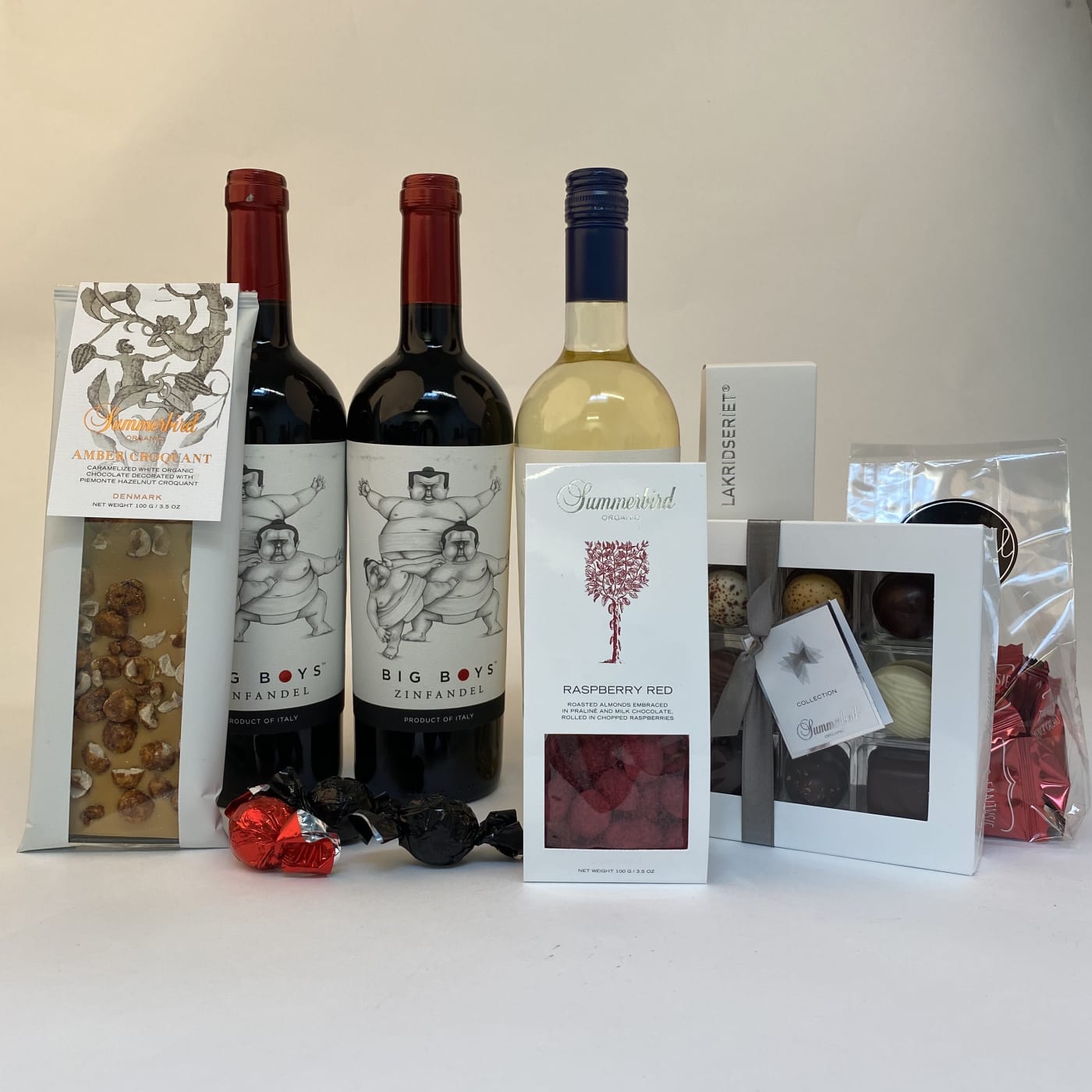 GaveKassen indeholder 1 flaske Big Boys hvidvin og 2 flasker Big Boys rødvin. Vinene er bløde og med masser af frugt og falder i god jord hos mange. Kassen indeholder også søde sager. Kassen indeholder: 1 Flaske Big Boys hvidvin 2 flasker Big Boys rødvin 1 lakrids fra Lakridseriet 1 pose mandler fra Summerbirdr 1 Truffles fra Weibel 1 chokolade æske selection 9 fra Summerbird 1 chokolade bar fra Summerbird 3 Chokolade kugler Gaven sendes i fin forsendelsesgaveæske, så det ser pænt og lækkert ud, når den modtages. Indholdet kan varierer, men min. værdien er den samme