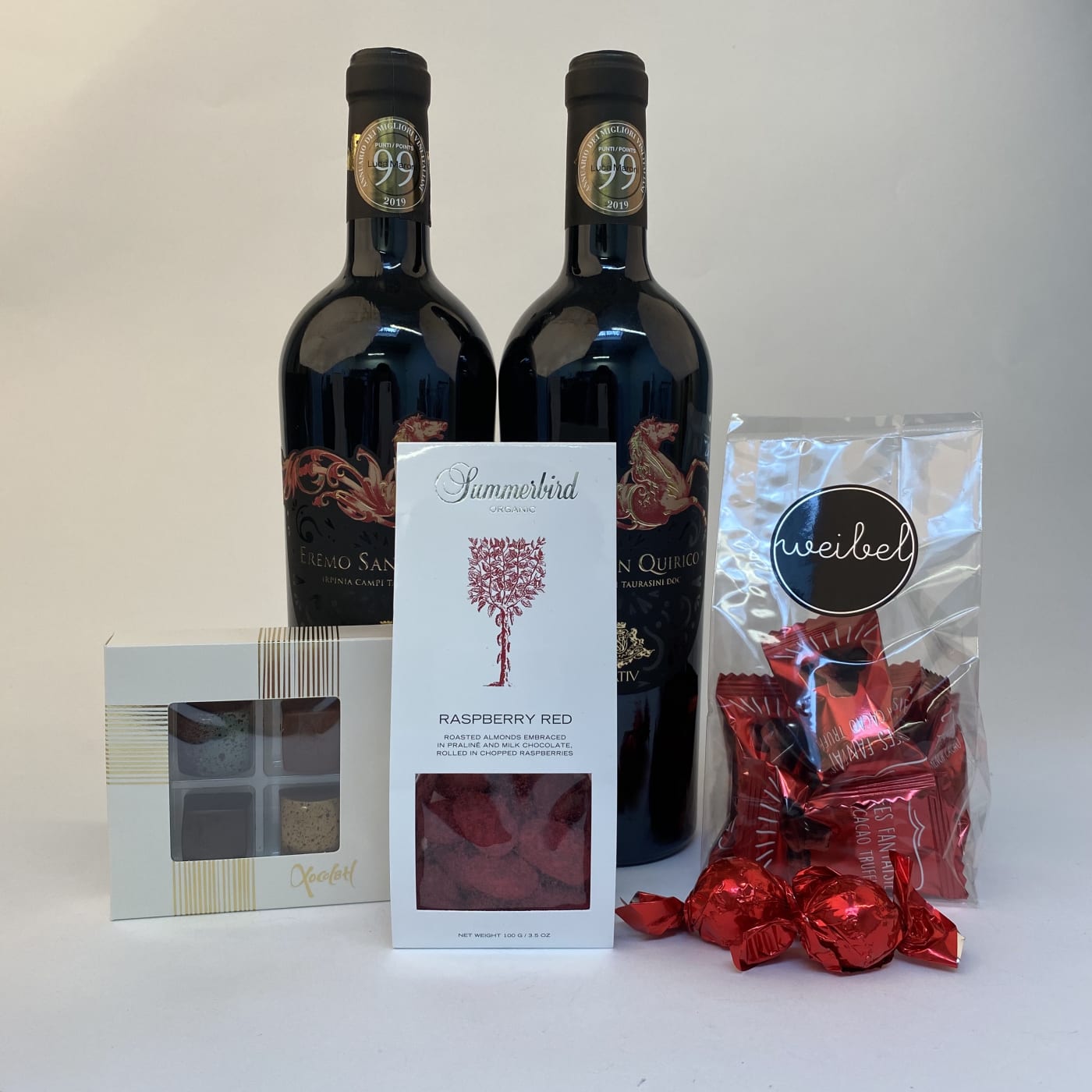 GaveKassen indeholder 2 flasker Eremo San Quirico rødvin, som er fraftfuld, frugtrig og krydret. Kassen indeholder også søde sager. Kassen indeholder:  2 flasker Eremo San Quirico rødvin  1 pose mandler fra Summerbird  1 Truffles fra Weibel  1 chokolade æske med 4 chokolader fra Xocolatl  2 Chokolade kugler Gaven sendes i fin forsendelsesgaveæske, så det ser pænt og lækkert ud, når den modtages. Indholdet kan varierer, men min. værdien er den samme