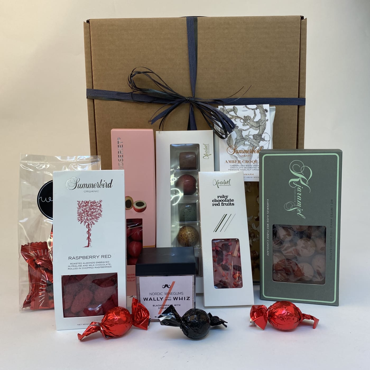 En Kasse fyldt med lækkerier, der går lige ind hos alle med en sød tand. Kassen indeholder: 1 æske Karameller fra Karamel fabrikken 1 Chokolade bar fra Summerbird 1 chokolade bar fra Xocolatl 1 æske chokolade med 5 stykker chokolade fra Xocolatl 1 bøtte vingummi fra Wally and whiz 1 lakrids fra Lakridseriet 1 pose mandler fra Summerbird 1 pose trøfler fra Weibel 3 chokolade kugler Gaven sendes i fin forsendelsesgaveæske, så det ser pænt og lækkert ud, når den modtages. Indholdet kan varierer, men min. værdien er den samme