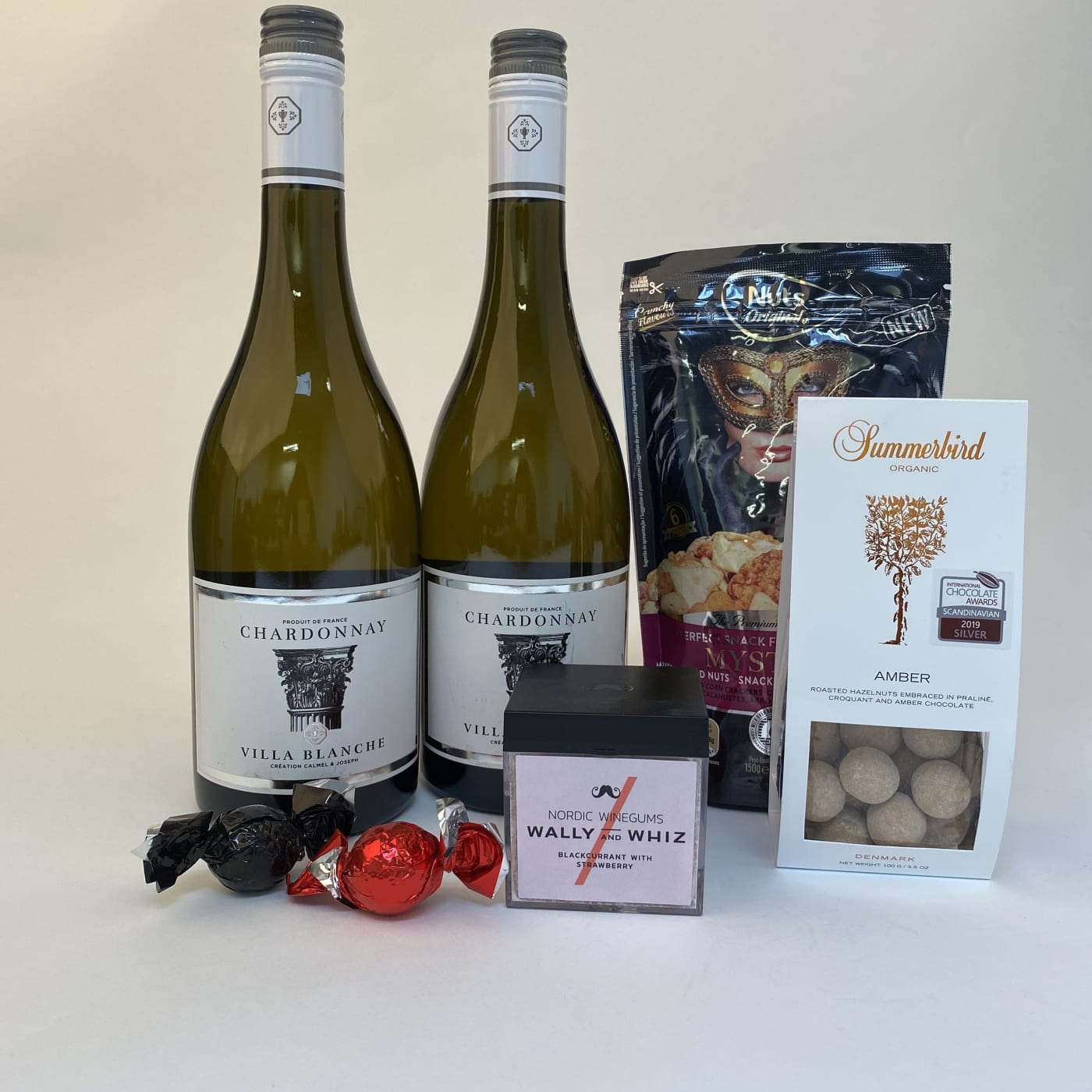 Denne GaveKasse indeholder 2 flasker franske hvidvine. Hvidvinen er blød og fyldig. Kassen holder også søde sager7 snacks Kassen indeholder: 2 flasker Villa Blanche Chadonnay hvidvin 1 pose nødder fra Nuts Original 1 pose mandler fra Summerbird 1 bøtte vingummi fra Wally and Whiz 2 chokolader Gaven sendes i fin forsendelsesgaveæske, så det ser pænt og lækkert ud, når den modtages. Indholdet kan varierer, men min. værdien er den samme