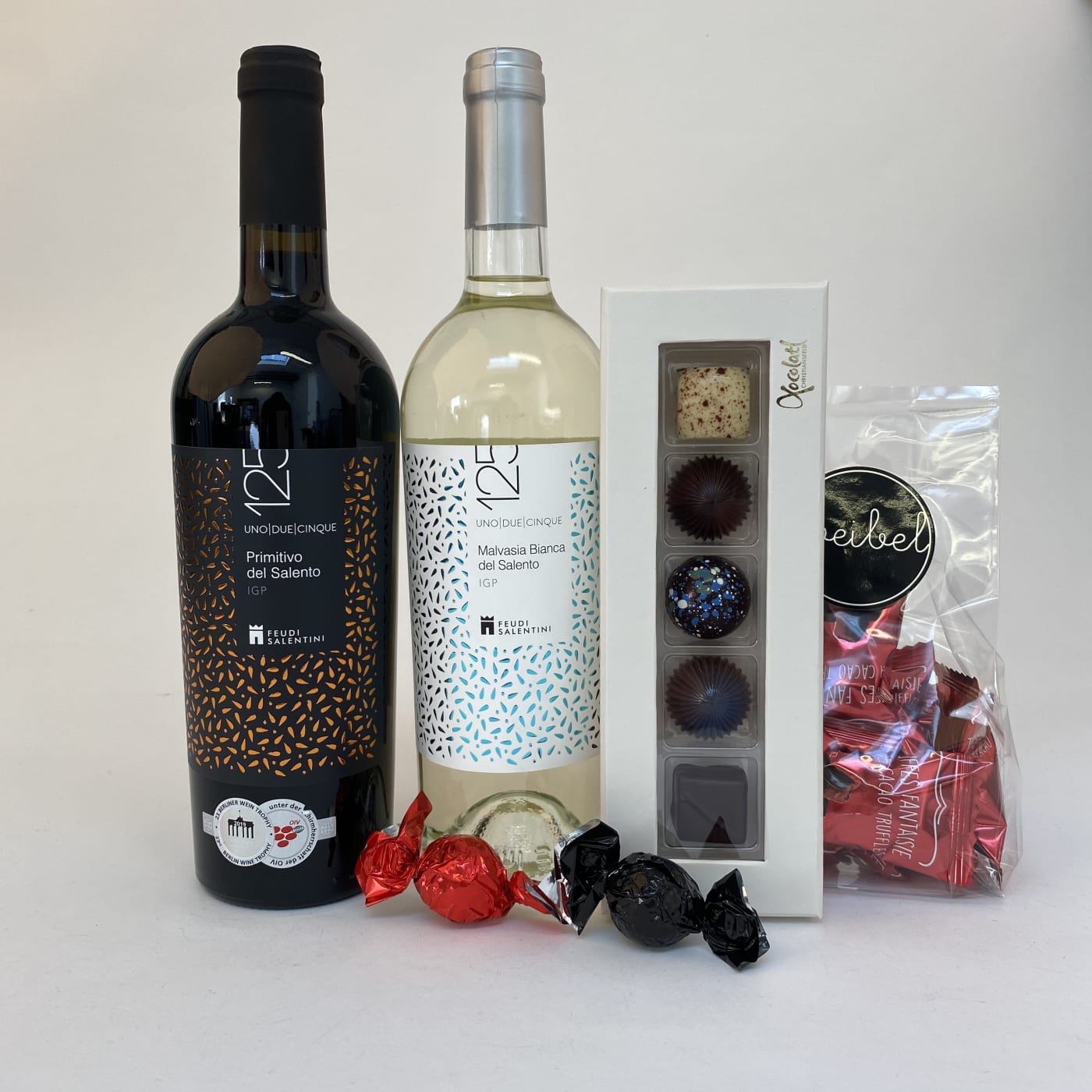 GaveKassen indeholder en flaske rødvin og en flakse hvidvin samt søde lækkerier Kassen indeholder: 1 Flaske 1-2-5 rødvin som er frugtrig og forholdsvis intens 1 flakse 1-2-5 hvidvin som er frisk og sødmefuld. 1 æske med 5 chokolader fra Xocolatl 1 Truffles fra Weibel 2 Chokoladekugler Gaven sendes i fin forsendelsesgaveæske, så det ser pænt og lækkert ud, når den modtages. Indholdet kan varierer, men min. værdien er den samme