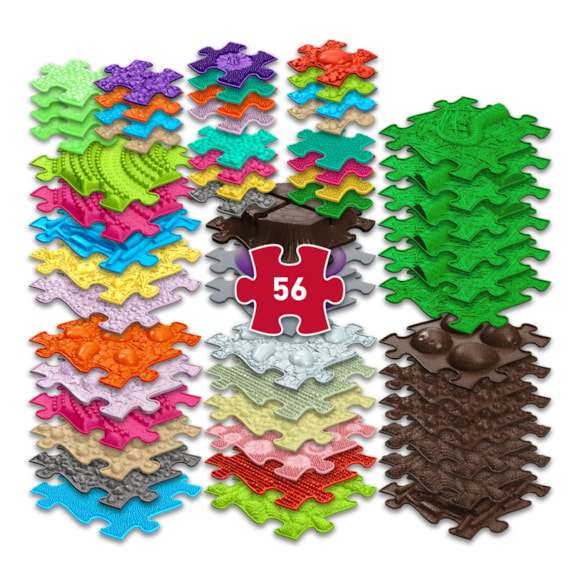 Diamant sæt med 56 forskellige plader. Dette sæt er det største af sansegulvene, og giver næsten uendelige muligheder for at sammensætte spændende stier, der stimulerer balance- og følesansen, eller lav en stor firkant, hvor der også er mulighed for at sidde, rulle eller kravle henover gulvet. Udover de velkendte, taktile plader, er der også tilføjet andre, spændende dele, der giver en yderligere dimension til legen og træningen af balance og proprioception. Der er en komplet balanceslange, så det også er muligt at lege med balancegang. To stk. magisk rotana, hvor der sidder en drejeskive på pladen. 1 træstub, der også kan bruges til at udvide og bygge gulvet sammen med forhindringsbanerne fra Muffik. Sansestimulerende gulv med forskellige overflader, der efterligner de flader, man finder i naturen, og som fødderne naturligt ville opleve, hvis vi ikke gik med sko. Sko og støvler berøver os rigitg meget sensorisk input, som vi egentlig er skabt til at opleve hver dag, mange gange om dagen, hvis vi stadig gik barfodede rundt. Jo tykkere og stivere, sålerne er, jo mere sansestimulitaion bliver vi frataget. Vi er skabt til at sanse rigtig meget gennem vores fødder, og de indeholder rigtig mange sansenerver, både i huden, men også omkring led og muskler, kaldet den proprioceptive sans.Denne mangel på stimuli kan give en manglende fornemmelse af grounding og dermed uro i kroppen. Gulvet er ekstra velegnet til de sansesøgende, der tit har brug for rigtig meget sensorisk input, for at give ro i kroppen. Det er også rigtig godt for de børn og voksne, som har svært ved at mærke sig selv og sin krop. Men gulvet kan også give rigtig meget godt til børn og voksne med et helt almindeligt reagerende nervesystem. De bliver nemlig også berøvet rigtig meget sanseinput og sansemotorisk træning af fødderne. Læg gulvpladerne i et gangareal, hvor man tit går frem og tilbage, så man nemt lige kan tage en tur henover gulvet, hver gang man går frem og tilbage. Læg dem foran sengen, så fødder og krop kan blive vækket om morgenen, eller brug dem til at komme ned i kroppen og mærke fødderne igen, inden man skal til ro om aftenen. Kort om gulvet: Kan give en grounding fornemmelse Virker beroligende ekstra god til de sansesøgende børn og voksne Forbedrer koncentrationsevnen Kan bruges til balancetræning Kan bruges til optræning af fodmuskulaturen Pladerne giver en taktil sansestimulering ved berøring, samtidig med at de giver en beroligende effekt og forbedrer koncentrationsevnen. Brug dem som beroligende og sansestimulerende dimse ting. Perfekt til når man skal sidde stille eller som et redskab i sanserum. Sættet består af 56 plader med forskellige overflader, hårdheder og farver. Materiale: PVC Indeholder 32 store og 24 små plader. Mål: store plader: 28,5 cm x 28,5 cm x 4,5 cm. Små plader: 14,3 cm x 17,3 cm. Kan rengøres med vand og sæbe. Alder: Fra 3 år Sættet indeholder følgende plader: 1x Blødt græs 3x Twister Hård 2x Dino æg blød 2x Småsten Hård 1x Muffik Hård 1x Muffik blød 1x Kastanjer Hård 1x Nødder Hård 1x Skov Hård 1x Strand blød 1x Træstamme Hård 1x pindsvin Hård 1x slangehoved hård 2x lige slange hård 2x buet slange hård 1x slangehale hård 2x Søstjerne blød MINI 2x Søstjerne Hård MINI 2x dino æg blød MINI 2x dino æg hård MINI 2x Græs Hård MINI 2x Græs blød MINI 2x snegle Hård MINI 2x Snegl blød MINI 2x eng blød MINI 2x eng hård MINI 1x søstjerne blød MINI selvlysende 1x dino æg blød MINI selvlysende 1x eng blød MINI selvlysende 1x snegl blød MINI selvlysende 1x kokosnød ECO ekstra hård 1x Træstammer ECO ekstra hård 2 x Nødder ECO ekstra hård 2x Skov ECO ekstra hård