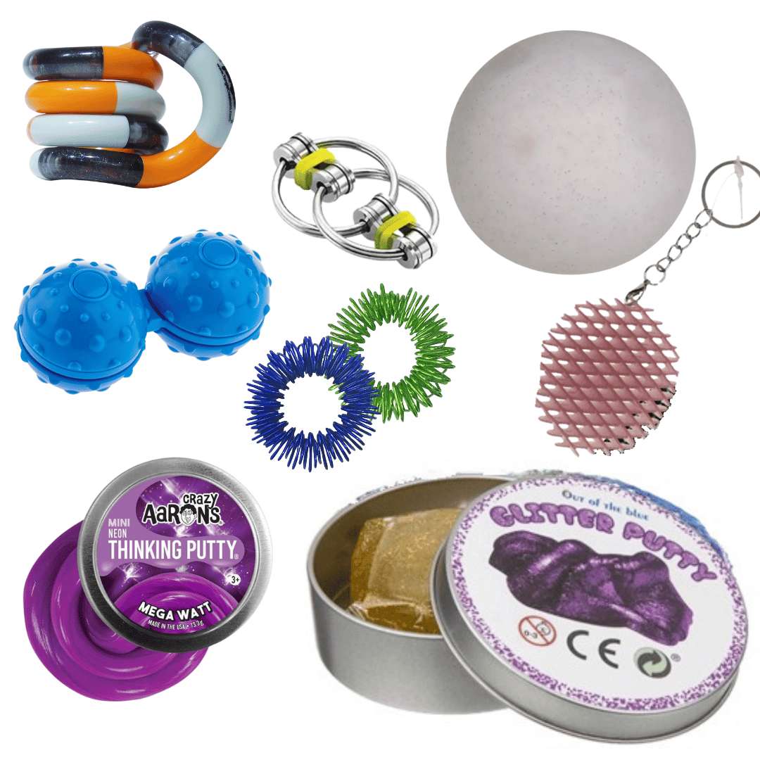 PILFINGERKASSE TIL STORE PILFINGRE – DISKRETE SANSE- OG FIDGETREDSKABER TIL TEENS OG VOKSNE Denne pilfingerkasse er særligt sammensat til teenagere og voksne, der har brug for diskrete sanseredskaber til at finde ro, koncentration eller afledning i hverdagen. Kassen indeholder et nøje udvalg af redskaber, som er lydsvage, taktile og nemme at have med – både i skole, på arbejdet og på farten. Indhold: 1 x snehvid stressbold (blød og glitrende) 1 x dobbeltbold til håndmassage 1 x Crazy Aarons mini Thinking Putty (formbar og let klistret uden at fedte) 1 x Tangle Jr. (bevægelsesredskab til hænderne) 1 x Flippy Chain fidget ring (taktile bevægelser uden lyd) 1 x sensory worm nøglering (blød, fleksibel og diskret) 2 x akupressur ringe (stimulerer sanser og kredsløb) 1 x glitter putty i dåse (visuel og taktil sansestimulering) Alle produkter leveres i assorterede farver. Pakkens indhold er valgt med fokus på sanseintegration, stressreduktion og diskret brug. Redskaberne egner sig godt til fx ADHD, autisme, angst eller blot til dem, der har glæde af små, beroligende aktiviteter i hænderne.