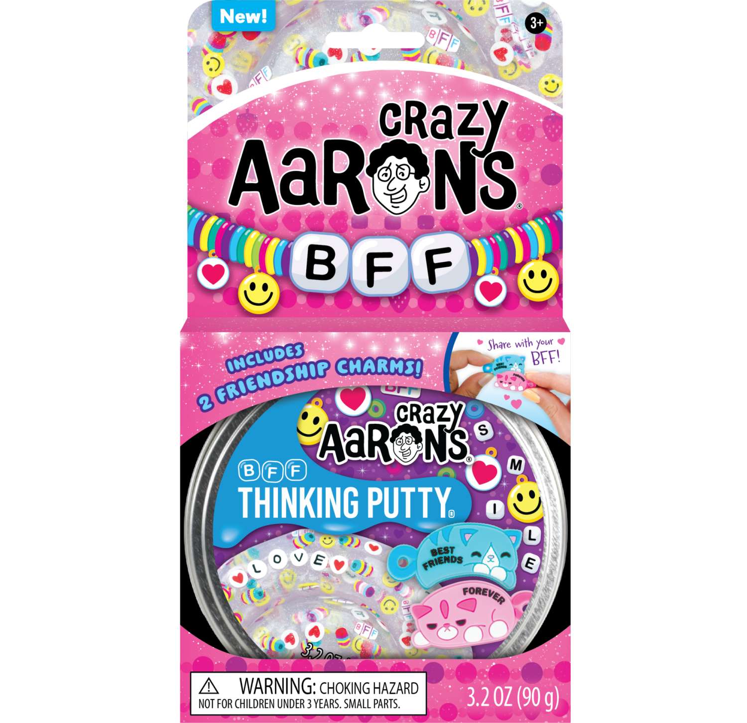 Crazy Aaron’s Thinking Putty – BFF (klar med glimmer, minicharms og to kattecharms) Venskab, glimmer og sanseleg – del magien med din bedste ven BFF Thinking Putty® er skabt til venner, der holder sammen for altid. Den krystalklare putty er fyldt med glitrende shimmer, minicharms og kommer med to BFF-kattecharms: én til dig og én til din bedste ven. Perfekt til små hyggestunder, symbolsk gaveudveksling og kreativ leg. Som en del af Trendsetters Collection følger BFF de nyeste trends i farver, temaer og fidgetuniverset – og rammer plet hos børn, der elsker både sanser, stil og venskabssymboler. Med 90g putty er der masser at dele, forme og udforske. Sansestimulering med et personligt twist BFF Thinking Putty® kombinerer taktile input med en følelsesmæssig betydning, hvilket gør den ekstra motiverende for mange børn. Den er oplagt til: Sensorisk regulering, hvor den glatte, klare putty giver rolige, dybe input Styrkelse af hænder og fingre, gennem stræk, klem og formning Fokus og nærvær, især for børn med ADHD, autisme eller uro Sansepauser, hvor de små bevægelser giver ro og grounding Charmsene tilføjer en ekstra dimension af struktur og leg – og gør putty’en oplagt som lille gave mellem venner. Kreativ leg og symbolske ritualer Med BFF Thinking Putty kan børn: dele en charm med deres bedste ven skabe små figurer eller mønstre lave “venskabsritualer”, hvor putty’en bruges til fælles hygge nyde glimmeret, når det bevæger sig gennem den klare base Den klare putty gør det også sjovt at skjule og finde charmsene igen og igen. Kvalitet og ansvarlig produktion Thinking Putty® er fremstillet i USA af ikke-giftig silikone. Den tørrer ikke ud, klistrer ikke og efterlader ingen rester.Produktionen foregår med hjælp fra mennesker med særlige behov – en vigtig del af Crazy Aaron’s sociale værdier. Specifikationer Farve: Klar med glimmer og minicharms + 2 BFF-kattecharms Indhold: 90g putty Egenskaber: Stræk, form, hop, riv, pop Materiale: Ikke-giftig silikone Alder: Fra 3 år Advarsel: Indeholder små dele – kvælningsfare Oprindelse: Fremstillet i USA