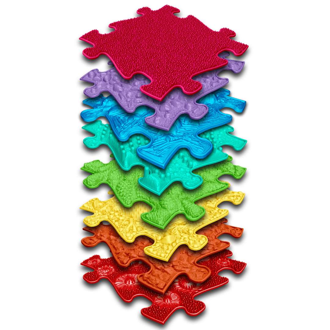 Regnbuesæt med 8 forskellige plader. Elsker du også det, når regnen og solskinet sammen maler en regnbue på himlen? Her får du mulighed for at skabe en hjemme, og endda en regnbue, du kan gå på! Dette sæt indeholder den ideelle kombination af faste og bløde måtter til at stimulere fodsålerne til forebyggelse og rehabilitering af flade fødder og nedsunken svangbue. Det inkluderer også 3D-typer af måtter, der styrker ikke kun fødder, ankler, knæ og hofter, men også de dybe muskler og dybe stabiliseringsmuskler i rygsøjlen, hvilket er afgørende for korrekt kropsholdning og sund udvikling. Men det er ikke alt. Sansegulvet udvikler fantasi, finmotorik, koordination, rumlig orientering, højre-venstre orientering og reaktionshastighed. Det lærer børn farver, tal og ord. Takket være det farverige design kan du øve dig i farvelære med dine børn og spille en masse sjove spil, som du kan finde på Muffiks YOUTUBE-kanal. Vi anbefaler dette sæt som et af basissættene, som du kan tilføje de måtter, der passer bedst til dig og dine fødder. Sansestimulerende gulv med forskellige overflader, der efterligner de flader, man finder i naturen, og som fødderne naturligt ville opleve, hvis vi ikke gik med sko. Sko og støvler berøver os rigitg meget sensorisk input, som vi egentlig er skabt til at opleve hver dag, mange gange om dagen, hvis vi stadig gik barfodede rundt. Jo tykkere og stivere, sålerne er, jo mere sansestimulation bliver vi frataget. Vi er skabt til at sanse rigtig meget gennem vores fødder, og de indeholder rigtig mange sansenerver, både i huden, men også omkring led og muskler, kaldet den proprioceptive sans.Denne mangel på stimuli kan give en manglende fornemmelse af grounding og dermed uro i kroppen. Gulvet er ekstra velegnet til de sansesøgende, der tit har brug for rigtig meget sensorisk input, for at give ro i kroppen. Det er også rigtig godt for de børn og voksne, som har svært ved at mærke sig selv og sin krop. Men gulvet kan også give rigtig meget godt til børn og voksne med et helt almindeligt reagerende nervesystem. De bliver nemlig også berøvet rigtig meget sanseinput og sansemotorisk træning af fødderne. Læg gulvpladerne i et gangareal, hvor man tit går frem og tilbage, så man nemt lige kan tage en tur henover gulvet, hver gang man går frem og tilbage. Læg dem foran sengen, så fødder og krop kan blive vækket om morgenen, eller brug dem til at komme ned i kroppen og mærke fødderne igen, inden man skal til ro om aftenen. Brug dem under bordet til dem, der søger meget med fødderne, når de sidder ned. Kort om gulvet: Kan give en grounding fornemmelse Virker beroligende ekstra god til de sansesøgende børn og voksne Forbedrer koncentrationsevnen Kan bruges til balancetræning Kan bruges til optræning af fodmuskulaturen Pladerne giver en taktil sansestimulering ved berøring, samtidig med at de giver en beroligende effekt og forbedrer koncentrationsevnen. Brug dem som beroligende og sansestimulerende dimseting. Perfekt til når man skal sidde stille eller som et redskab i sanserum. Sættet består af 8 store plader med forskellige overflader, hårdheder og farver. Materiale: PVC Indeholder 8 store plader Mål: store plader: 28,5 cm x 28,5 cm x 4,5 cm. Kan rengøres med vand og sæbe. Alder: Fra 3 år Sættet indeholder følgende plader: 1x Blødt græs 1x Twister hård 1x Dino æg bløde 1x Småsten bløde 1x pindsvine hård 1x Kastanjer bløde 1x Eng hård 1x Skov hård Testet i henhold til EU standard EN71-1:2014, A1:2018, EN71-2:2011 + A1:2014 og 71-03:2019-08.