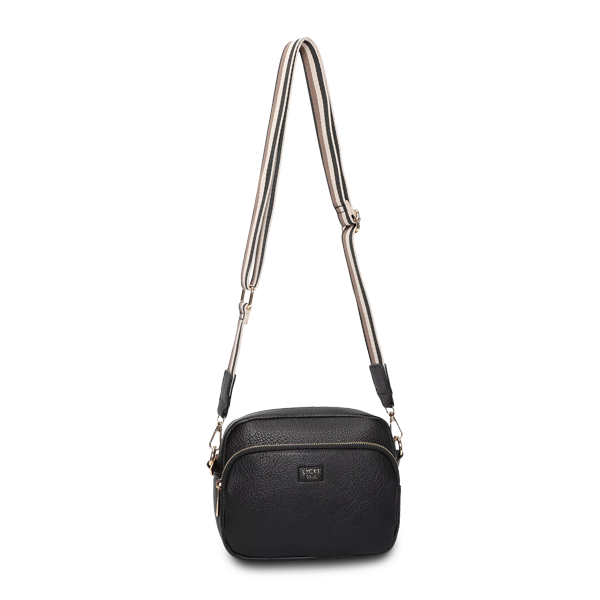 Smart skuldertaske i sort kunstlæder fra Lycke Oslo En stilren og moderne skuldertaske fra Lycke Oslo i den populære kamerataske-model. Tasken er fremstillet i blødt sort kunstlæder med struktur og har et elegant, men afslappet udtryk – perfekt til både hverdag og byliv. Den brede, aftagelige skulderrem i flerfarvet tekstil giver et trendy twist og god bærekomfort. Tasken har to rum, der lukkes med lynlås – et hovedrum og en større frontlomme – begge med smarte, gyldne detaljer. Indvendigt finder du en lynlåslomme og et åbent rum, mens bagsiden har en ekstra lomme med lynlås. En praktisk og chic crossover, der rummer alt det vigtigste. Gør dit outfit komplet med denne elegante Lycke Oslo taske – bestil i dag og få hurtig levering! Se hele udvalget fra Lycke Oslo her. Specifikationer Materiale: Kunstlæder Farve: Sort Foer: Beige med hjerter Lukning: Lynlås Metaldetaljer: Guld Rem: Aftagelig og justerbar tekstilrem (drop 37–66 cm) Indvendige rum: 1 lynlåslomme, 1 åbent rum Udvendige rum: 1 frontlomme med lynlås, 1 baglomme med lynlås (15 cm) Bredde: 8 cm Højde: 16 cm Længde: 20 cm Mærke: Lycke Oslo Leverandørnummer: 8043705 EAN: 7321051148798