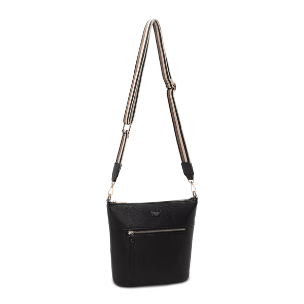 Trendy bucket bag crossover i sort kunstlæder fra Lycke Oslo En moderne og praktisk skuldertaske fra Lycke Oslo i blødt sort kunstlæder. Tasken har en rummelig form med bred bund, der giver god plads til hverdagens nødvendigheder. Den sporty, stribede skulderrem i tekstil kan justeres og tages af, så tasken både kan bæres crossbody eller over skulderen. Tasken lukkes med lynlås foroven og har både en lynlåslomme på fronten og bagsiden. Indvendigt finder du en lynlåslomme samt to åbne rum, så du nemt kan organisere dine ting. Gyldne detaljer giver tasken et elegant touch og gør den velegnet til både hverdagsbrug og fritid. Et perfekt valg til dig, der vil kombinere funktionalitet med skandinavisk stil – bestil din Lycke Oslo taske i dag! Her ser du hele udvalget af Lycke Oslo. Specifikationer Materiale: Kunstlæder Farve: Sort Foer: Beige med hjerter Lukning: Lynlås Metaldetaljer: Guld Rem: Aftagelig og justerbar tekstilrem (drop 38–72 cm) Indvendige rum: 1 lynlåslomme, 2 åbne rum Udvendige rum: 1 frontlomme (18 cm), 1 baglomme (18 cm) – begge med lynlås Bredde: 11,5 cm Højde: 23,5 cm Længde: 23 cm Kategori: Skuldertasker / Bucket bag Mærke: Lycke Oslo Leverandørnummer: 8053213 EAN: 7321051167393