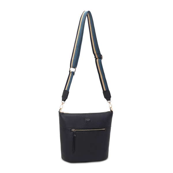 Trendy bucket bag crossover i mørkeblåt kunstlæder fra Lycke Oslo En moderne og rummelig skuldertaske fra Lycke Oslo, fremstillet i blødt mørkeblåt kunstlæder med en flot, let kornet struktur. Tasken har en bred bund, der giver ekstra plads, og den sporty, stribede skulderrem i tekstil giver et friskt og moderne udtryk. Remmen kan justeres og tages af, så du nemt kan bære tasken både crossbody og over skulderen. Tasken har lynlåslukning foroven samt både front- og baglomme med lynlås. Indvendigt finder du en lynlåslomme og to åbne rum – perfekt til organisering af dine ejendele. Gyldne detaljer giver tasken et elegant præg, som passer til både hverdag og fritid. Et perfekt valg til den moderne kvinde, der ønsker en funktionel og stilren taske. Bestil din Lycke Oslo bucket bag i dag! Se hele udvalget af Lycke Oslo her. Specifikationer Materiale: Kunstlæder Farve: Mørkeblå Foer: Beige med hjerter Lukning: Lynlås Metaldetaljer: Guld Rem: Aftagelig og justerbar tekstilrem (drop 38–72 cm) Indvendige rum: 1 lynlåslomme, 2 åbne rum Udvendige rum: 1 frontlomme (18 cm), 1 baglomme (18 cm) – begge med lynlås Bredde: 11,5 cm Højde: 23,5 cm Længde: 23 cm Kategori: Skuldertasker / Bucket bag Mærke: Lycke Oslo Leverandørnummer: 8053213 EAN: 7321051167423