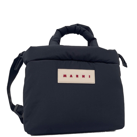 Puff tote-taske i sort fra Marni, lavet i teknisk stof med et blødt, puffy design og syntetisk fyld. Tasken har lynlåslukning, dobbelte hanke og en justerbar skulderrem, der giver fleksible bæremuligheder. Perfekt til både hverdag med sit lette og rummelige design.