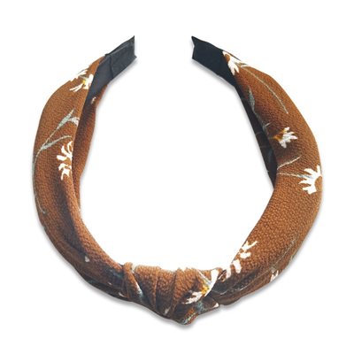 Ashley – flower hårbøjle toffee. Blomsterprint hårbøjle med en knude på toppen, som kan bruges til både hverdag og fest.\nHårbøjlen giver flere forskellige stylingsmuligheder, og holder samtidig håret væk fra øjnene. Den tilføjer dig en moderne håropsætning, der holder hele dagen.\nEverneed hårbøjler strammer ikke bag ørerne, og ønsker du dem yderligere udvidet, kan de forsigtigt strækkes vandret, så hårbøjlen udvider sig.\n\n- Farve - Brun\n- Materiale - Polyester\n- Størrelse - 13cm Ø
