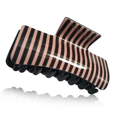 Shelby – stribet latte. Hårklemme i et stribet design, som fungerer perfekt til mange forskellige anledninger.\nKlemmen giver opsætningen et moderne og stilrent udtryk i håret. Du kan sætte hele eller lidt af dit hår op – alt efter hårtykkelse – og tænderne på indersiden giver et godt greb, som sikrer, at klemmen bliver siddende hele dagen igennem.