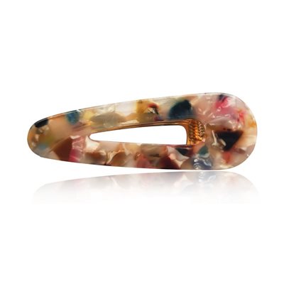 Molly M – triangel colourful. Trekantet hårspænde i et enkelt design med mønster, som fungerer perfekt til simple håropsætninger og som pynt.\nSpændet giver opsætningen et moderne og feminint udtryk i håret. Hårspændet lukkes med en klemme for at sikre, at det sidder, som det skal.d\n\n- Multi og guld\n- Højglanspoleret cellulose acetate og metal\n- Længde: 6,8 cm og bredde: 2,2 cm