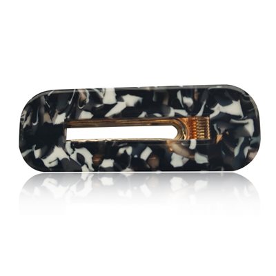 Misty square – black. Sort firkantet hårspænde i et enkelt design med mønster, som fungerer perfekt til simple håropsætninger og som pynt.\nSpændet giver opsætningen et moderne og feminint udtryk i håret. Hårspændet lukkes med en klemme for at sikre, at det sidder, som det skal.\n\n- Sort og guld\n- Højglanspoleret cellulose acetate og metal\n- Længde: 6,5 cm og bredde: 2,2 cm