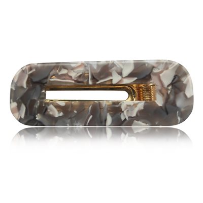 Misty square – stone grey. Gråt firkantet hårspænde i et enkelt design med mønster, som fungerer perfekt til simple håropsætninger og som pynt.\nSpændet giver opsætningen et moderne og feminint udtryk i håret. Hårspændet lukkes med en klemme for at sikre, at det sidder, som det skal.\n\n- Grå og guld\n- Højglanspoleret cellulose acetate og metal\n- Længde: 6,5 cm og bredde: 2,2 cm