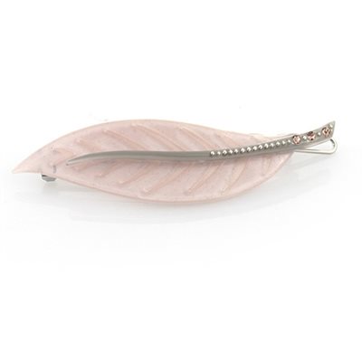 Calla Leaf – bladspænde rose. Et smukt hårspænde med sten formet som et blad, som fungerer perfekt til simple håropsætninger.\nHårspændet giver kontrol over håret, så det holdes på plads, og giver opsætningen et feminint udtryk i håret.\nHårspændet lukkes med en tryklukning for at sikre, at det sidder, som det skal.\n\n- Farve - Rosa\n- Materiale - Højglanspoleret cellulose acetate og rhinsten\n- Størrelse - Længde: 6,5 cm