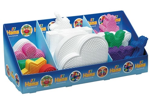 Stiftplader til Hama perler. Stiftpladerne fåes både som formstøbte firgurer og plader, hvor man kan lave sine egne mønstre og motiver.