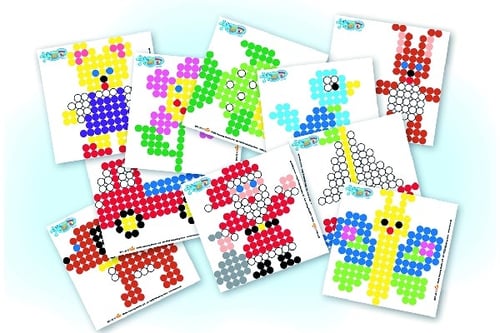 Stiftplader til Hama perler. Stiftpladerne fåes både som formstøbte firgurer og plader, hvor man kan lave sine egne mønstre og motiver.