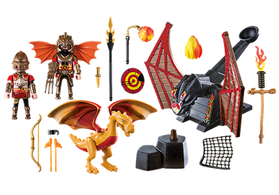 med en liten drake och olika träningsmaskiner. Mått (katapult): 6–16,5 x 9–15 x 11 cm (LxBxH) Även en drake måste träna regelbundet. Burnham Raiders har därför utvecklat en sofistikerad stridsträning. Olika träningsredskap förbereder drakarna på angrepp från riddarfienden. Med katapulten skjuter draktränaren Tyragon eldklot i luften som den smarta draken skickligt undviker. Då måste Burnham Raiders komma på något annat för att locka fram det farliga monstret ur reserven. Kanske har eldskytten Archibald någon idé? Spelsatsen består av Novelmore-figurerna draktränaren Tyragon och eldskytten Archibald Blazebow, en drake, en katapult med tre eldklot samt mycket annan drakträningsutrustning. Recommended for ages 8 and up.