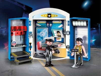 På denna polisstation har bovarna inget att skratta åt! Den smarta polisen har just gripit en skurk och låser genast fast honom i väggen med handbojor. "Se åt det här hållet", säger polisen till fången. Han måste ta ett gripandefoto. Bilden och alla personliga ägodelar registreras naturligtvis noggrant i datorn. Den modiga PLAYMOBIL-polisen är alltid beredd att upprätthålla lag och ordning. Den praktiska leklådan består av två uppfällbara dubbeldörrar och bakom dem döljer sig en hel liten polisstation. Leksetet innehåller två PLAYMOBIL-figurer, polis och bov, kamera, handbojor, signalspade och många fler polistillbehör.