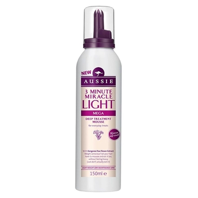 Aussie Mega 3 Minute Miracle Light 150ml är en Intensivt hårmask som vårdar och bygger upp överbehandlat och torrt hår. Förbättrar hårets barriär och låser in fukt för ett starkt och skinande hår utan friss. Räddaren som ger törstigt hår massor av fukt, för ett lyckligt sagoslut. Tas direkt efter applicering upp av håret för optimal reparation och styrka. Hårets fjällskikt återuppbyggs samtidigt som håret repareras och stärks.