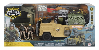 BeskrivningPrepare soldiers for any situation! The Battle Training Truck is equipped with spinning gun turrets on the roof, rear and hood. The convertible top can be removed to reveal storage for supplies or drape it over the side for an instant canopy providing shade. There’s also a barracks building where the soldiers can strategize. Soldiers fit inside truck to man the weapons on the roof and rear. Roll the soldiers along in the free-wheeling truck. Press the button on the rooftop weapon for lights and sounds. Press the button on the rear weapon to shoot projectiles. Includes action figures and accessories. With your help, the soldiers are ready for victory! Includes two Soldier Force action figures.Specifikationer:Färg:GrönVikt:10 KG