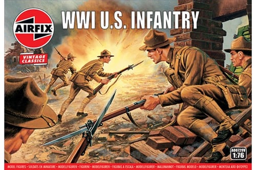 WWI U.S. Infantry 1:76Mould Tools made in 1967, pack Illustration by Brian Knight, 1969. Enjoy the nostalgia with Airfix Vintage Classics.These are the “Doughboys” that arrived in France and took part in the last great battles of the First World War. Their equipment includes light machine guns and a remote-controlled rifle.Contains 48 unpainted figures.