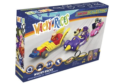 Micro Scalextric Wacky Races (Mains Powered)Peter Perfect takes on Dick Dastardly in this one-on-one Micro Scalextric race set.Who will win? You decide, will it be the menacing ‘Mean Machine’ driven by Dick Dastardly and Mutley, or ‘Turbo Terrific’ driven by the dashingly cool Peter Perfect. This mains-powered set contains over 4metres of track, with 9 layout options including a loop the loop and a vertical stunt ramp.Tech SpecsSpace Required: 81 x 120cmTrack Length: 408cmScale: 1:64Age Suitability: 3+