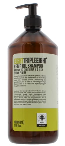 BeskrivningEight Triple Eight Eighttripleeight Schampo Hampa rensar effektivt din hårbotten och tvättar håret ordenligt så att det återfår sin naturliga skönhet. Använd en passande mängd shampoo i vått hår, massera in det och skölj därefter noggrant.Oavsett vilket hår du har så har vi ett shampoo som passer perfekt till just ditt hår.Innehåll1 LAktiva ingredienser