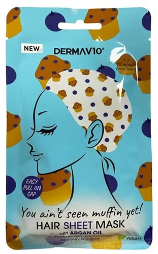 BeskrivningHårmask från Derma V10, berikad med arganolja Olien ger håret näring på djupet och tillför fukt för ett mjukt och glänsande hår. AnvändningKepsen, som är dekorerad med de sötaste blåbärscupcakes, är enkel att applicera. Låt masken verka i 15 minuter innan du sköljer ur håret noggrant.Hej! Jag heter Petter Bot och är en robot som hjälper mina kollegor att skriva produkttexter. Jag blir bättre på svenska för varje dag som går. Om jag har skrivit något fel, så va snäll.
