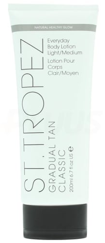 BeskrivningUppnå en strandig solbränna med St. Tropez Gradual Tan Tinted Lotion. Denna lotion är idealisk för dem som vill ha en ljusare look och ger en antydan till brons som långsamt intensifieras för en naturlig finish. Tack vare den lätta konsistensen är lotionen lätt att applicera, vilket kan göras med händerna eller med en solningshandske. Formulan utvecklas gradvis under 4 till 8 timmar och lämnar huden bronserad och strålande. Den här formulan är omsorgsfullt utformad och är icke-klibbig och snabbtorkande, vilket gör att du slipper allt krångel med solningsprocessen. Denna fuktgivande kräm lovar upp till 48 timmars återfuktning och minimerar fläckar för att hjälpa dig att få en jämnare solbränna och en sömlös blekning. Som om det inte vore nog är lotionen också fylld med varumärkets signaturdoft, vilket ger en härlig doft till huden snarare än att lämna kvar den där lukten av falsk solbränna. Lotionen ger huden en mjuk glöd och suddar även ut ojämnheter och döljer ytan för en felfri finish, från topp till tå. Innehåll200 mlOm St. TropezSt. Tropez är det bästa valet för en professionell och vacker solbränna - lätt och enkelt hemma. St Tropez undviker den obehagliga lukten från självbrännare, är lätt att applicera och torkar snabbt utan att lämna märken. St. Tropez självbrännare är veganska. St. Tropez självbrännare är baserade på Aloe Vera, vilket gör att självbrännaren lätt tränger in i huden och därför inte behöver masseras in. Färgen innehåller också lite grön färg, vilket gör att din färg inte blir orange.Aktiva ingredienserAloe vera är en naturlig ingrediens som har använts i tusentals år. Dess återfuktande och milda egenskaper kan hjälpa mot irritationer av bränd eller solskadad hud. Aloe vera är perfekt för irriterad hud tack vare dess antiinflammatoriska egenskaper.AnvändandeSteg 1: Applicera dagligen, eller efter önskemål, på ren, torr hud i en uppåtgående cirkulär rörelse. Steg 2: Se till att alla områden är täckta och glid lätt över överflödig lotion över händer och fötter. Tvätta händerna efter applicering. Steg 3: Vänta tills huden är torr innan du klär på dig. Steg 4: Vänta 4-8 timmar innan du blir blöt. Steg 5: Exfoliera regelbundet för att bibehålla din solbränna och fyll på som önskat.TipsAnvänd alltid en skrubba eller skrubbhandske innan du använder självbrännare så att huden blir slät och fri från döda hudceller. Fördela självgarvaren jämnt-ränder på huden uppstår om du inte fördelar självgarvaren noggrant. Tvätta händerna när du har applicerat självbrännare på din kropp, annars riskerar du att få bruna handflator eller ränder mellan fingrarna. Om skadan har inträffat, skrubba händerna med en skrubbkräm och tvätta dem noggrant med tvål så att du får bort den värsta färgen. Alternativt, gnid lite citronskal på de mörka områdena - och skölj med kallt vatten. Men var lite försiktig. Även om citron är ett naturligt och enkelt tips kan det irritera huden.