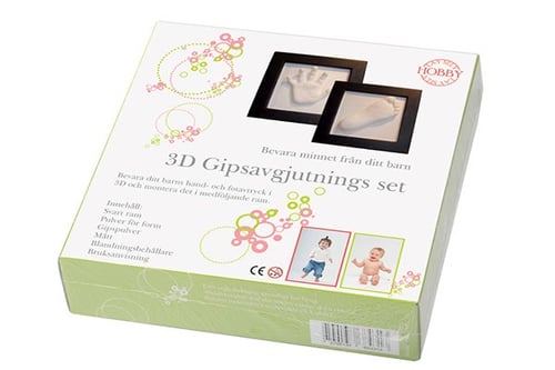 DIY sæt til 3D afstøbningSættet indeholder gipspulver til at lave et aftryk af en barnehånd eller fod. Og ramme til at montere aftrykket i.Der medfølger brugsanvisning.