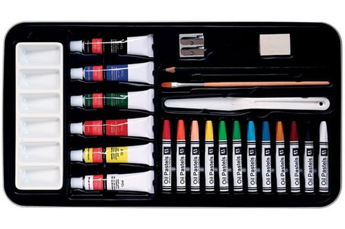 Gavesæt til oliemaling.Indeholder 6x12 ml. oliemaling på tube, 12 oliepastelkridt, pensel, blyant, blyanspidser, viskelæder, plast palet, plast paletkniv.Velegnet til hobbybrug, som begyndersæt.