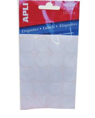 APLI 02663. Produktens färg: Vit, Form: Rektangel, Typ av lim: Permanent. Diameter: 1,9 cm. Etiketter per förpackning: 120 styck