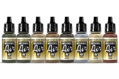 Matt acrylic colors, water-based and especially formulated for airbrushing. The Model Air color range contains the most complete selection of the military colors used in recent history, including the colors of WWI, WWII and up to the present. Each color is based on extensive research by our experts of the existing and previous military references so as to offer the modeler the highest possible historical accuracy.Model Air is used directly or diluted with Vallejo Airbrush Thinner or Flow Improver. It is recommended to first prime the surface, and then apply Model Air in several layers. The colors dry very rapidly and form a homogenous paint film of extraordinary resistance while preserving even the smallest detail of the model.For airbrushing these colors, the compressor air pressure is recommended at 15 – 20 PSI or 0.5 to 1 kg. Model Air can of course also be applied with a brush. For correct airbrush maintenance we recommend using the Vallejo Airbrush Cleaner.Model Air is not flammable, and does not contain solvents.