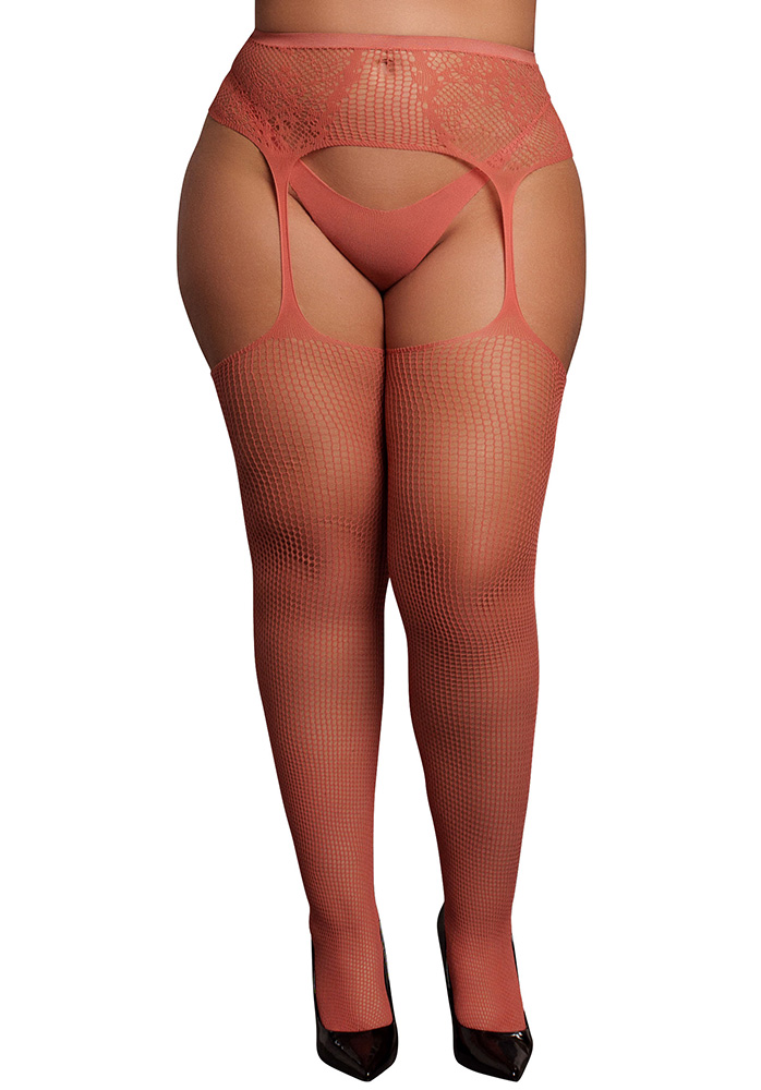 Fishnet and lace garterbelt stockings, red - Queen Size