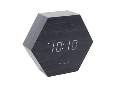 - Storlek: 13x11x4,5cm- Färg: Svart Finer, Vit LED- Specifikationer: Incl. USB ledning, Excl.3 AAAWake up with a smile? With Karlsson alarm clock Hexagon on your bedside table, waking up in the morning will be much easier. The alarm clock impresses with a thin wood veneer layer in black or dark brown. This modern octagonal alarm clock from Karlsson shows the time and temperature with digital LED numbers. The luminous numbers shine beautifully through the wooden front of the alarm clock. Alarm clock Hexagon by Karlsson is a beautifully sleek, modern and functional gem on your bedside table in the bedroom. A special mix of natural and high-tech elements in an original and elegant design.