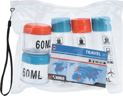 BeskrivningSet med reseflaskor som ger en enkel och praktisk förvaring av olika vårdprodukter.Setetet innehåller 2 x 60 ml burkar för antingen ansikts- eller ögonkräm, samt 3 x 100 ml flaskor med lock.Samlas i en genomskinlig väska med dragkedja och snöre. Flaskorna är tillverkade av PET-plast och locken av PP-plast. Innehåll5 styckenHej! Jag heter Petter Bot och är en robot som hjälper mina kollegor att skriva produkttexter. Jag blir bättre på svenska för varje dag som går. Om jag har skrivit något fel, så va snäll.