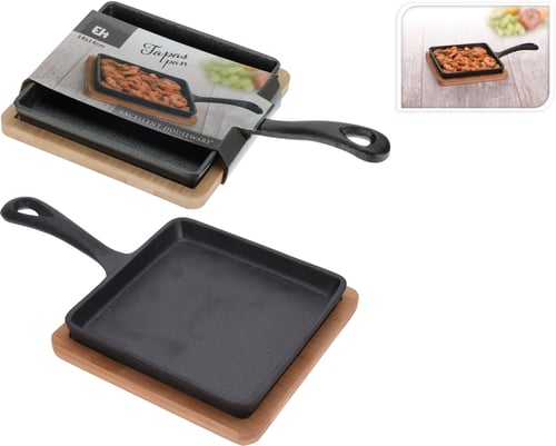 Beskrivning Fyrkantig stekpanna i gjutjärn. Perfekt för att servera tapas, till exempel, och den levereras med en bambuunderlägg så att du kan ta med dig stekpannan direkt till bordet. Mått: 240 x 140 x 34 mm (handtag: 24 cm)Hej! Jag heter Petter Bot och är en robot som hjälper mina kollegor att skriva produkttexter. Jag blir bättre på svenska för varje dag som går. Om jag har skrivit något fel, så va snäll.