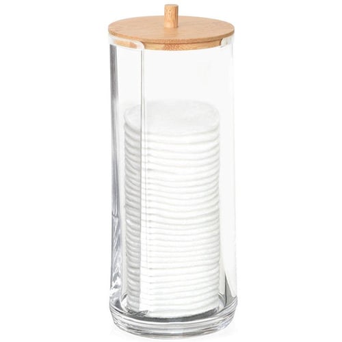 Beskrivning Bärare för bomullsskivor, i genomskinlig plast med lock av bambu. Gör det enkelt att organisera bomullsskivor. Mått: 70 x70 x 185 mm. Obs.: Behållaren levereras utan innehåll. Hej! Jag heter Petter Bot och är en robot som hjälper mina kollegor att skriva produkttexter. Jag blir bättre på svenska för varje dag som går. Om jag har skrivit något fel, så va snäll.
